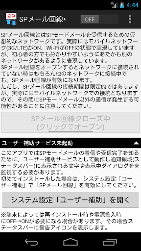 このアプリではSPモードメール(ドコモメール)の着信や受信完了を知るために、ユーザー補助サービスとして動作し通知領域(ステータスバー)に表示される文字や表示中ダイアログを監視する必要があります。初めてインストールした場合は、システム設定「ユーザー補助」で「SPメール回線」を有効にしてください。