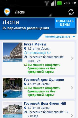 В данном приложении можно найти полную информацию (цены, сервис, наличие мест, фотографии, расположение на карте) практически о всех значимых гостиницах, отелях, гостевых домах и пансионатах, расположенных в 70 населенных пунктах Крымского полуострова. Информация распределена по городам и курортным посёлкам Крыма в алфавитном порядке. Из приложения можно без комиссии забронировать номер в понравившемся месте с помощью известного сервиса бронирования.