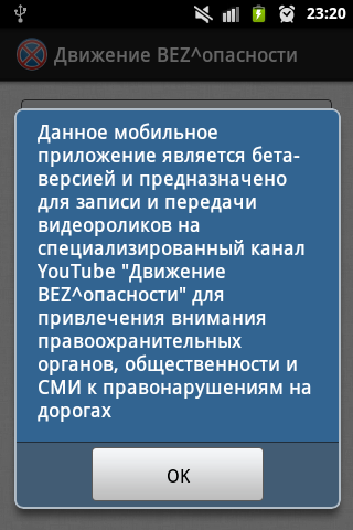 Данное мобильное приложение предназначено для записи и передачи видеороликов на специализированный канал в YouTube "Движение BEZ^опасности" https://www.youtube.com/channel/UCqOrca1u9sL4z4mX7zmE3Tw для привлечения внимания правоохранительных органов, общественности и СМИ к правонарушениям на дорогах