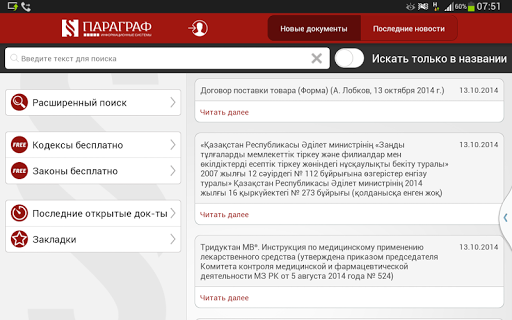 Бесплатно основные правовые документы: Конституция РК, все Кодексы (в том числе кодексы стран СНГ) и все основные законы.