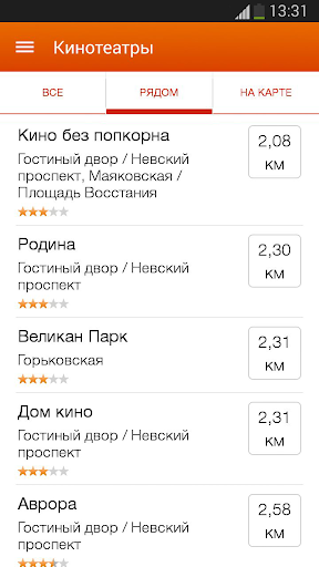- удобный фильтр кинотеатров по расстоянию от пользователя