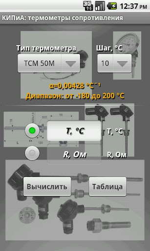 Приложение состоит из двух частей. Первая часть приложения предназначена для работы с термометрами сопротивления. При этом использовался ГОСТ 6651-2009 ГСИ "Термопреобразователи сопротивления из платины, меди и никеля". Метрологические характеристики, нормируемые в соответствии с данной программой, распространяются на чувствительные элементы термометров сопротивления при подключении непосредственно к их выводам и на термометры сопротивления при подключении к клеммам головки в соответствии с указанной изготовителем схемой. Если на корпусе термометров сопротивления с двухпроводной схемой указано значение сопротивления внутренних проводов, то оно должно быть вычтено из значения измеренного сопротивления термометра сопротивления.