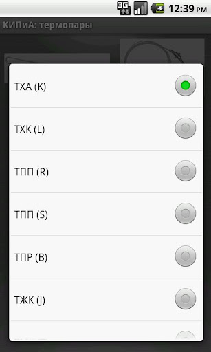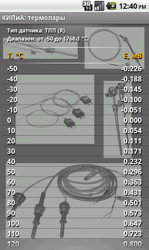 Вторая часть приложения предназначена для работы с термопарами. При этом использовался ГОСТ Р 8.585-2001 ГСИ "Термопары. Номинальные статические характеристики преобразования". Значения ТЭДС термопар в зависимости от температур их рабочих концов при температуре свободных концов 0 градусов Цельсия, рассчитаны по полиномам, аппроксимирующим эти зависимости.