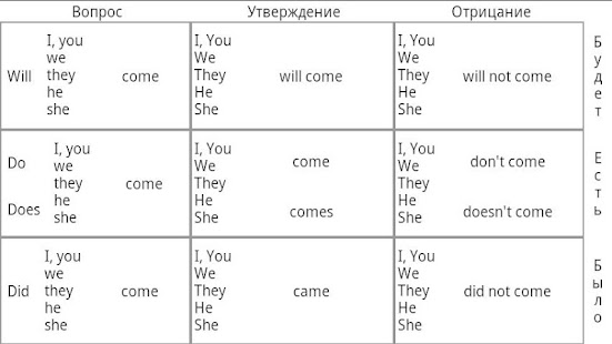 В таблицу выстраиваются 3 формы высказывания (утвердительная, отрицательная или вопросительная) и 3 времени (прошедшее, настоящее и будущее).