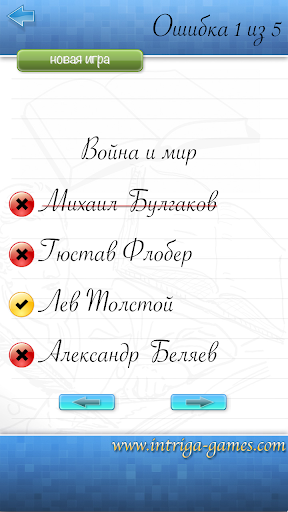 Если вы ошибочно закрыли ответы на пройденный тест - не волнуйтесь, в любое время вы сможете провести работу над ошибками, повторно пройдя все вопросы викторы, которые вызвали у вас сложность. Программа автоматически запоминает их и предлагает потренироваться заново. Таким образом, по мере игры, вы будете знакомиться с новыми писателями и их творчеством.
