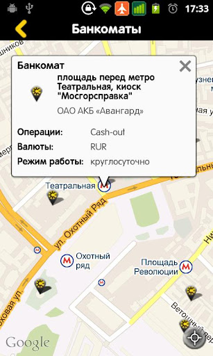 Мобильное приложение определяет место нахождения пользователя и отображает на карте список ближайших от него банкоматов с краткой информацией, содержащей название объекта, адрес и доступный вид операций. На карте также можно найти точки погашения кредитов и быстро проложить до них маршрут.