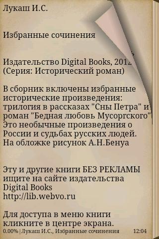Книги Издательства Digital Books обладают небольшими размерами и не требовательны к ресурсам смартфонов и планшетов. Наши приложения не посылают SMS с Ваших телефонов на платные номера и не интересуются Вашей личной информацией.