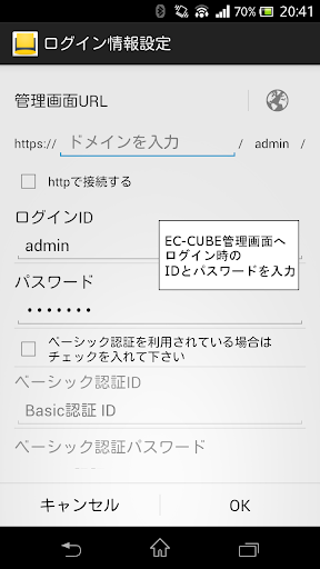 まず、ログイン情報設定画面でECショップの管理画面へアクセスするため以下の情報を入力します。