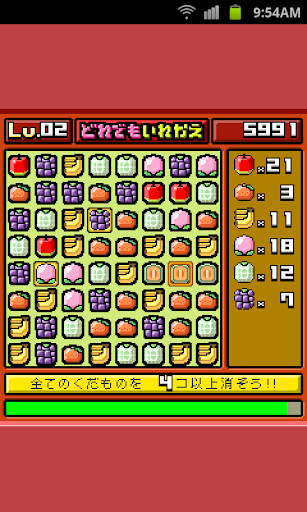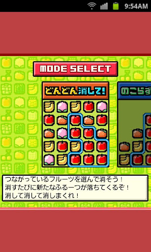 画面いっぱいにつまった色々なフルーツの中から、同じ種類のフルーツを選んでどんどん消していくというのが基本的なルール。フルーツを消せば残り時間が増え、一定数消せばレベルアップ!レベルアップすると残り時間の減りも早くなるなどシビアに!タイムオーバーまでにはたしてどれだけ得点を稼げるでしょうか?