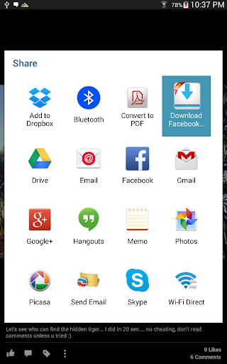打开Facebook的应用程序,选择你要下载的图片,点击您的手机的菜单按钮,选择共享。您的照片会自动下载。