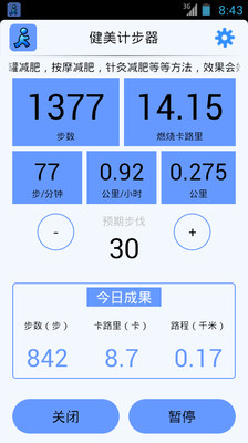 健美计步器是您运动时的步数追踪器。可以计算出你在运动或减肥过程中的卡路里消耗,让你对自己的运动效果了如指掌。专门为健美,健身,减肥等追求身体健康完美一组打造, 可实时显示各项运动参数:步行速度、运动时间、距离、耗脂等数据一目了然。更有智能的语音服务,为您实施播报当前运动状态, 提升云的的乐趣。让你目标化自己的减肥或健身计划。