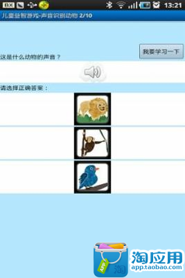 儿童益智游戏-声音识别动物: * 有趣而生动的动物图片和叫声 * 简单而生动的儿童益智游戏,儿童通过它可以认识各种动物及叫声,增长知识 * 中英文对照,寓教于乐 * 父母喜欢的亲子游戏