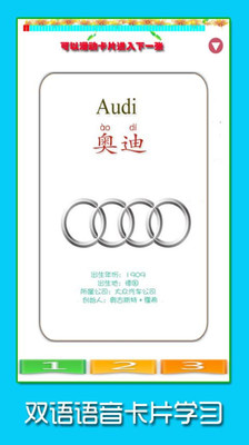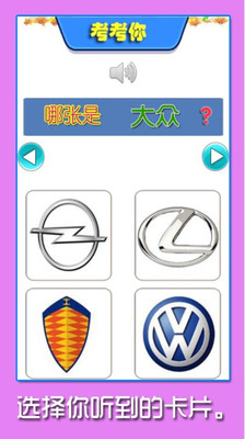 儿童教育,认识汽车标志,有声读物,早教 ,阅读教育 ,故事读物,智力开发。儿童识汽车标志是一款儿童认识所有汽车标志的教学软件。采用交互式学习方式, 由可爱的卡通卡片和小朋友进行互动,场景漂亮可爱。帮助宝宝在玩耍中学习。并且通过考试游戏和记忆游戏的模式增加学习的娱乐。