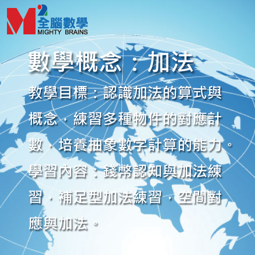 學習內容:錢幣認知與加法練習,補足型加法練習,空間對應與加法。