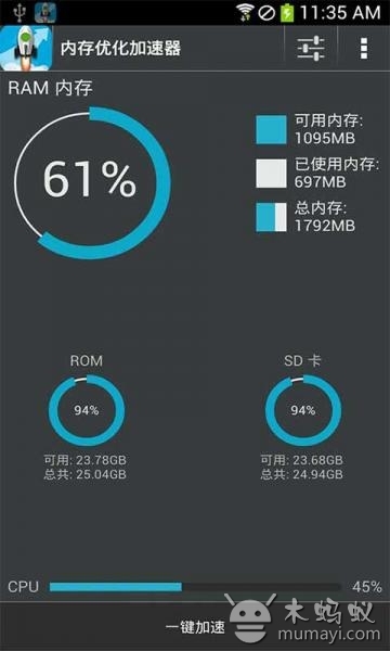 提高手机速度,让手机操作更顺畅、不费电、游戏不顿卡!软件能通过清理手机内存、运存、缓存,从而达到加快手机运行速度以及省电的目的。软件特点:1、帮您解决手机内存不足、运存不足的问题;2、具有自动优化功能和手动一键快速优化功能;3、具有白名单、摇一摇清理、锁屏自动加速等实用功能;4、通过简单的图表,可轻松查看内存使用的情况;5、当手机可用内存过低时,软件会自动帮您进行加速,告别顿卡;6、软件可帮您管理您的后台程序,一键轻松关闭多余的后台程序;7、有多款桌面小工具(桌面小插件)供您快速查看手机运行情况!