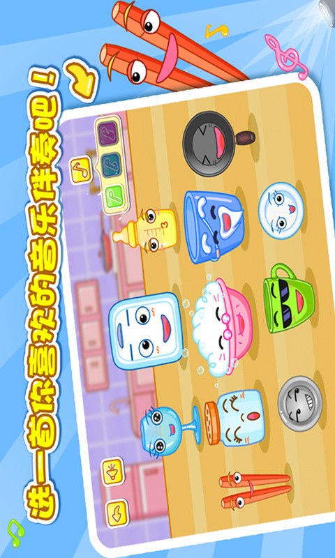 在这,为您的宝宝学习打击乐,不需要花很多钱买昂贵的乐器,让宝宝知道创意来源于生活的点点滴滴,鼓励宝宝创造性的开发音乐。奇奇和妙妙会带着厨房里的朋友加入音乐派对。厨房里的朋友都有自己的独特的声音,有锅,筷子,糖,盘子,杯子,菜板……和它们一起,你将能够发现自己的音乐天赋。现在你准备好做特别的音乐了吗?出发吧……