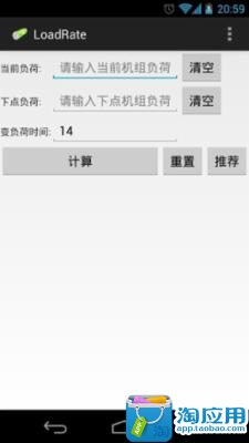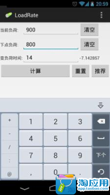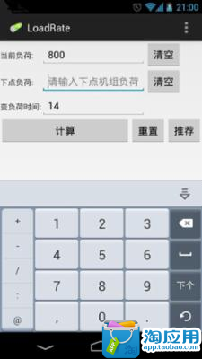 发电机组每十五分钟就需要更新负荷,以满足用电量变化的需求。这十五分钟内发电功率的变化速度需要手动计算。用计算器计算的话很繁琐,需要输入两组数据,进行加减乘除计算。该应用只需要输入一个数据就可以得到发电功率的变化速度,非常省力,非常好用。减少了重复计算变负荷率的麻烦了!!!不在用计算器的减法,第一次计算输入当前负荷和下点负荷,以后使用是需要点击重置,输入下点负荷,点击计算,变负荷率计算出来了~~~~~~~