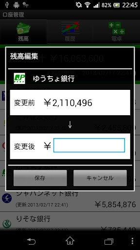 登録した口座をロングタップし「残高編集」を選択すると、現在の残高が表示され、変更後の残高を入力することができます。