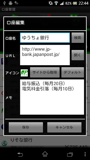 このアプリケーションは、銀行口座の残高を記録することにより、複数の銀行口座の残高合計や残額履歴を管理することができます。各銀行口座毎にURLを登録することが可能で、簡単な操作で銀行のサイトにアクセスし残高確認をサポートします。