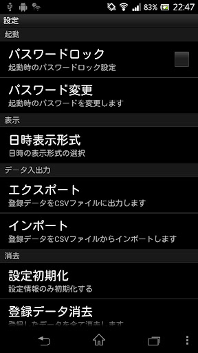 本アプリケーションの起動時にパスワードによるロックを設定することができます。パスワードを失念した場合、リカバリーする手段は有りませんので、ロックを利用する場合は設定したパスワードを失念しないようにご注意ください。
