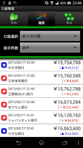 登録した口座をロングタップし「残高履歴」を選択すると履歴タブに移動し、選択した口座の残高履歴が閲覧できます。また、履歴タブでは履歴を表示する口座や表示件数を選択可能です。