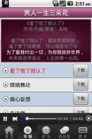 ————记孟杨《男人一生三朵花》面市张爱玲说,每个男人的一生中都有两朵玫瑰,一朵白玫瑰,一朵红玫瑰。娶了红玫瑰,红玫瑰渐渐地变成了墙上的一抹蚊子血,而白玫瑰却成了窗前明月光;娶了白玫瑰,白玫瑰渐渐地变成了衣服上粘住的一个米饭粒,而红玫瑰却成了胸口的一颗朱砂痣。 这名女子认为“男人一生三朵花”,“一朵水仙/一朵玫瑰花/可是我愿做那朵最美的康乃馨/给你温暖,抚平你伤口/不让你漂流/能让你心安”。这样的女子不是纯情的水仙花,多情娇弱,亦不是火热的玫瑰,烈酒一般的醉人,对着她心爱的男子,她只想做那朵温情的康乃馨,给他心安,给他暖暖的、流动着的温情。 都说爱的最高境界是敌得过平淡的流年,可是,又有多少相爱的男女在平淡的、日复一日的流年中松开了原本相携的手,只因为,柴米油盐酱醋茶的日常生活没有了初恋的悸动与强烈的情愫,平装版的对方自然不如精装版的他人来得有味道,于是,多少男人松开了康乃馨的手,去寻找、猎艳,水仙花的纯洁多情在他心里眼里就是明亮如星辰的仙子,而红唇烈焰的玫瑰花,在他的视线里,是一杯馥郁浓香的鸡尾酒——绚丽纷呈,让他不能自已。人说男人一生有三朵花。孟杨其人便是一个执着于爱情的女子,无论历经多少曲折,她都乐观地说:我相信爱情,爱情是真实地存在着的。满腹才气付之于音乐创作,她在音乐这条路上走得磕磕绊绊,然却笑意盈然。为何?执着于所爱,爱着这份执着,关乎爱情,关乎音乐,关乎创作,关乎梦想,关乎音乐的未来,关乎未来的音乐。正是因了这份痴爱,孟杨演绎这首《男生一生三朵花》,纯粹是本色诠释。她不是那名最优秀的歌手,但是,毋庸置疑,孟杨是那名最用心、最精诚的歌手!