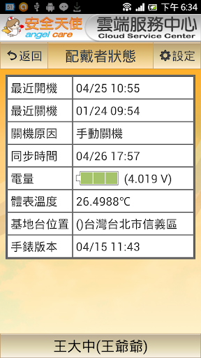 2)佩質者狀態:可查詢裝置服務狀態(開關機/電量/同步時間/版本)