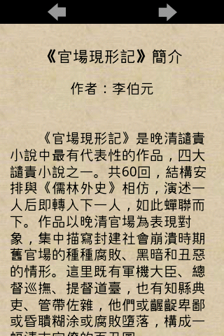 《官場現形記》是晚清譴責小說中最有代表性的作品,四大譴責小說之一。共60回,結構安排與《儒林外史》相仿,演述一人後即轉入下一人,如此蟬聯而下。作品以晚清官場為表現對象,集中描寫封建社會崩潰時期舊官場的種種腐敗、黑暗和醜惡的情形。這裡既有軍機大臣、總督巡撫、提督道台,也有知縣典吏、管帶佐雜,他們或齷齪卑鄙或昏聵糊塗或腐敗墮落,構成一幅清末官僚的百醜圖。