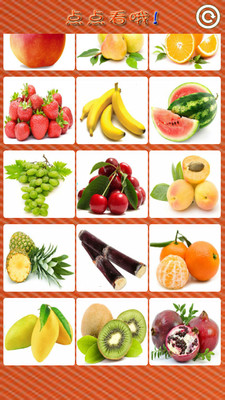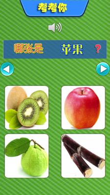 第二部: 点读部分, 第三部分: 测试部分. 根据软件的提示宝宝点读对应的水果这种趣味的学习方式培养的宝宝对事物的认知 经过第一二部分学习之后即可在第三部分测试学习效果. 好不好玩, 试试便知道.