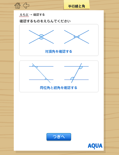 このアプリは中学2年生の「平行線と角」が学べるアプリです。「AQUAアクア」シリーズの全アプリを簡単に呼び出すことができる「総合メニュー」を合わせてご利用いただくと便利です。
