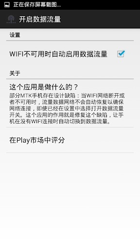部分MTK手机ROM存在设计缺陷:当WIFI网络断开或者不可用时,流量数据网络不会自动恢复以保持网络连接,即使已经在设置中选择打开数据流量开关。这个应用的作用是修复此缺陷,让手机在没有WIFI连接时自动切换到数据流量。