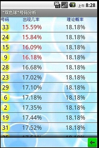 本软件帮您统计以往所有的开奖数据,并将各个号码的出现概率按从小到大排列,为您购买彩票提供参考。