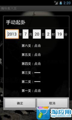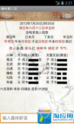 1.本软件具有以下起卦方式:可以摇钱起卦;可以手动选择卦爻进行排卦;有源于梅易的时间卦,数字卦,其中数字卦分为1个数起卦,2个数起卦;有抽签起卦,此种方式属于娱乐起卦方式便于未研究六爻及未深入者娱乐。 2.本作品主要面向有看卦基础的人并为此配备相应的周易卦辞和本人的简短六爻分析,同时兼顾外围乐于娱乐起卦的人。 3.本作可以导出卦例至sd卡保存以便传输至电脑上,具有复制卦例以便使用者用手机发送邮件,信息等,可以调节字体大小,可以横竖屏显示卦例等 4.本作经过前几个品种的画面彻底改良相信看上去更舒适 专业易学软件值得信赖!