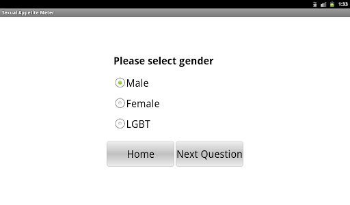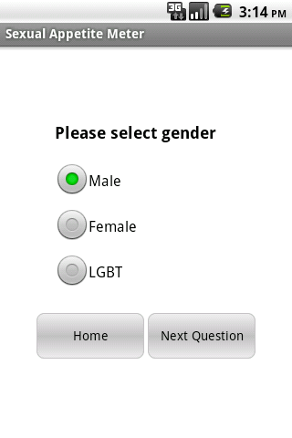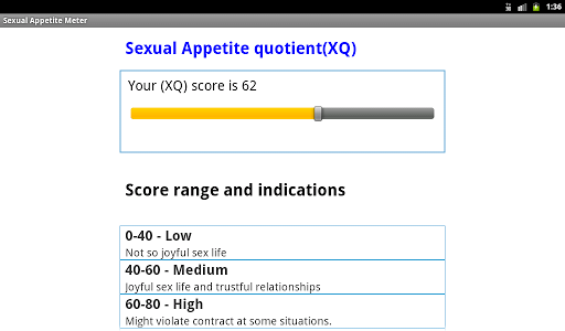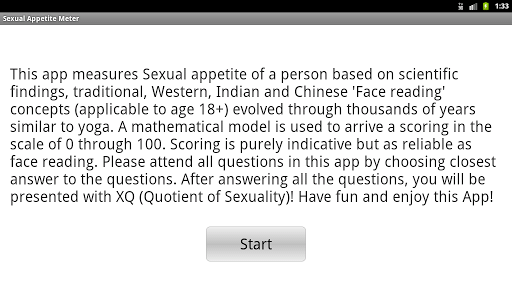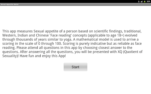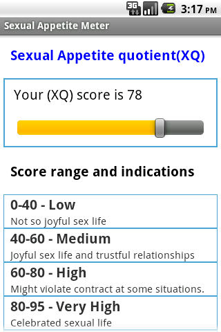 它是簡單,只要點擊前進箭頭鍵和後退箭頭按鈕之間的問題,並帶你能想到的最接近的匹配的問題作出回應。如果你喜歡這個程序(賭) ,你可以給你的朋友分享這個應用程序的下載鏈接,並有一組有趣的測量每個人的性慾。誰知道?這可能是一個啟示,你隱藏的口味!
