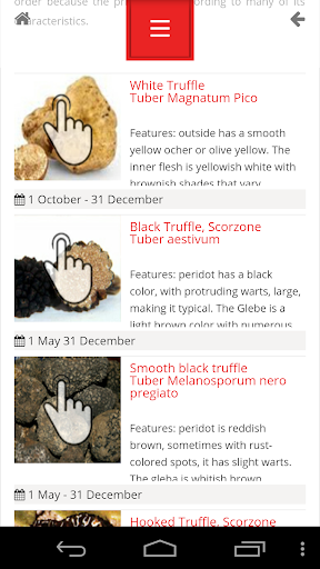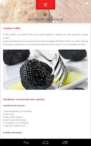 通過我們的應用程序,你可以找到各種類型的松露,它們的時間和報價的信息收集。另外,每個星期會發布到美味的食譜,讓我們跟隨加深對知識的烹飪和美食這一特定領域。