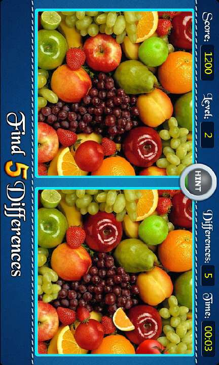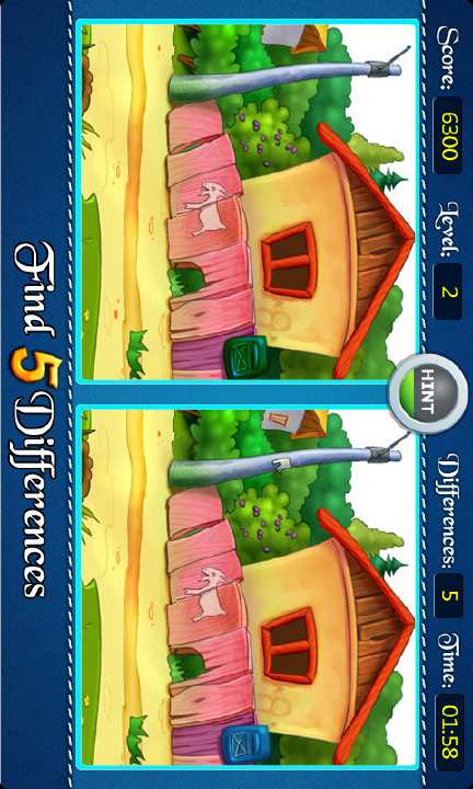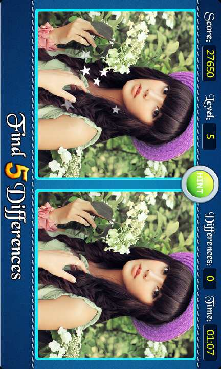 本游戏分为四种场景:清新美女、田园风光、诱人水果、酷炫跑车!每种场景都有5个关卡,不同的类型会有不同的享受哦!在每个关卡中,会有提示,实在不会了可以点击它哦,当然还有时间限制,一般是2分钟,所以必须在2分钟内,找到5个不同点,那么关卡就通过了!非常的好玩,赶快下载享受快乐吧!