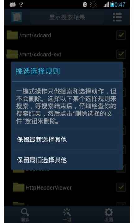 手机存储卡中经常会有重复的文件存在,比如有着不同名称内容却是相同的MP3,备份软件多余的备份等等,这些多余的文件会占用很多的存储空间。本软件可以帮助您搜索存储卡中哪些文件是有重复的,根据搜索的结果您可以做如下操作:删除(批量)文件:将您选择的文件从存储卡中删除,文件被删除后无法还原,此操作须慎重,对于没有把握的文件请酌情处理。移除(批量)记录:将您选择的记录从搜索结果中移除,不会删除文件。