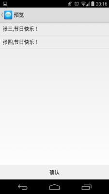 用于群发短信,如消息内容为:“节日快乐!”,联系人选择了"张三"、"张四",则对张三发送“张三,节日快乐!”,对张四发送"张四,节日快乐!"。
