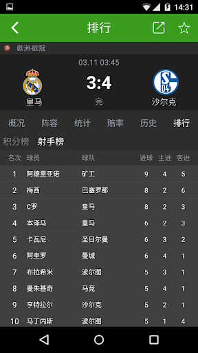 5.资料库:世界各地大小联赛、杯赛的实况统计、积分榜、射手榜,俱乐部球队、球员等信息