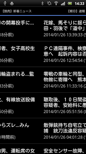 主要新聞の記事を一覧表示します。記事の一覧はタブ形式でジャンル別に表示し、スワイプすることで順次横断チェックできます。気になるタイトルをタップすることで記事を読むことができます。このアプリは読売新聞、朝日新聞、毎日新聞、産経新聞、日経新聞のRSSを読み込むので各社の記事を比較することができます。