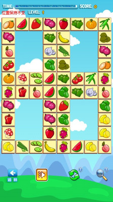 相信大家对连连看的玩法都不陌生,两个相同的水果蔬菜连在一起可以消除,在规定的时间内把水果全部消除即可获胜。