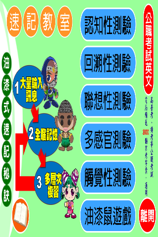 在「油漆式速記法-公職考試英文」正式版軟體中精選3000個常考字彙,適用高普考、特考等國家公職考試。軟體主要功能包括認知性、回溯性、聯想性、多感官、觸覺性、油漆鼠遊戲等單元,其中「油漆鼠遊戲」結合經典小遊戲的娛樂性、易操作、黏著性、話題性及遊戲機制等特點,兼具學習、娛樂、過關、競賽性質的單字學習遊戲。