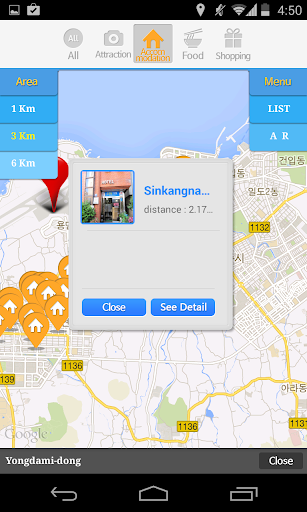 7. 周边搜查 : 搜索您现在的位置周边的旅游景点,餐馆,住宿,购物信息