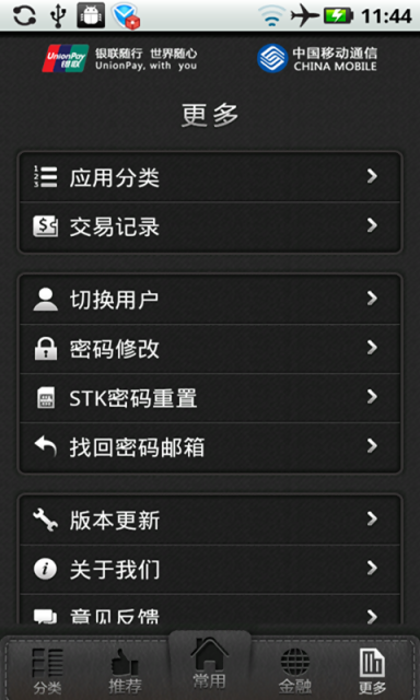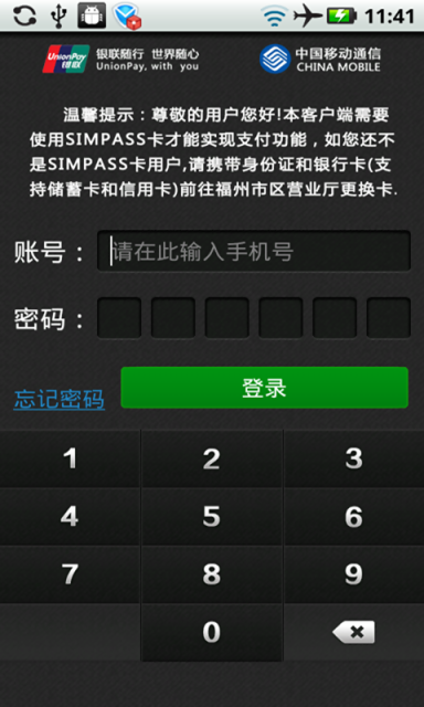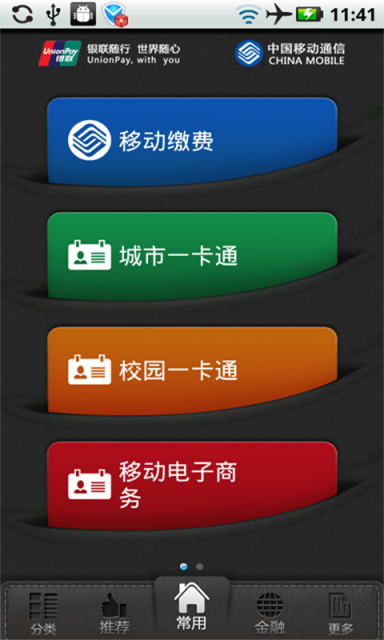 银联移动支付客户端是由银联和移动协作开发的便民服务应用软件,该软件支持联机交易和脱机交易;支持手机上信用卡还款、电子现金空中圈存、手机话费充值、缴电费、缴税费等功能。电子现金可在所有标有银联闪付标志的POS机上消费