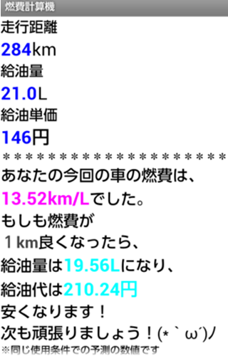 結果には今回の燃費のほか、今回の燃費より1km多く走行できることができたら今回の給油量は○○Lになって○○円安くなります!という計算もして表示しています。