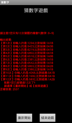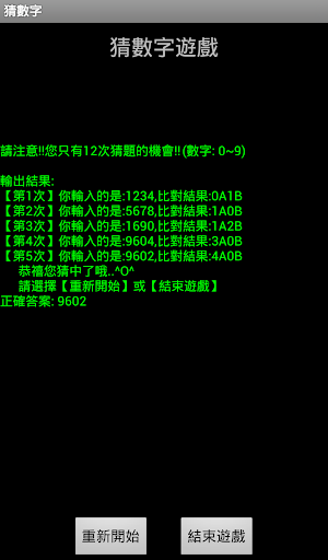 接著玩家再根據電腦回答的幾A幾B繼續猜,直到猜中(4A)為止。