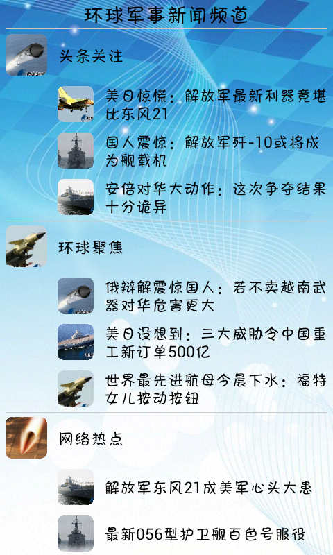 本应用综合各方热点,及时介绍世界军情,分析变幻莫测的国际局势,增强民族忧患意识,普及全民国防教育,刊登全球军事报道,纵览全球风云,追踪军事热点