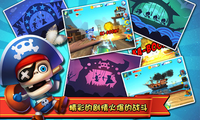经典海盗题材全3D动作射击大作。用手指点击屏幕投掷各种武器道具,消灭搞怪的骷髅小海盗。夺取传说中的海盗宝藏,成为新的海盗之王! 这是一个大航海的时代,有个传奇的黄金海盗王,他拥有不死之躯,他烧杀抢掠无恶不作,他在全世界掠夺金银财宝…… 谁能与之抗衡?谁能获得他的无尽宝藏? 梦想成为海盗之王的你,死而复生后又重装上阵,为了搜寻黄金海盗王的踪迹,消灭他的骷髅海盗军团;为了救出心爱的女人,夺取传说中的海盗宝藏!现在,拿起武器,穿好铠甲,挂上骷髅旗,在浩瀚的大海上,开始我们浪漫刺激的冒险之旅吧! 游戏评测: 采用强大的3D引擎技术,呈现最酷最炫的全3D立体游戏效果! 点击触摸屏操作的射击游戏方式,抛弃难受的虚拟摇杆,绝佳手感,会带来完美新颖的操作体验! 可爱滑稽的骷髅小海盗形象,演绎各种轻松搞笑的Cosplay秀。丰富的动作表情,甚至还会演绎江南style! 九种滑稽奇特的武器:皮搋子会吸脸上、电池会放电、扳手会砸晕、忍者镖会插到身上、仙女棒会变水果……会让你杀敌乐此不疲!。 超过20种神奇的卡牌道具,召唤天神,投掷奶牛,流星火雨……轰杀骷髅海盗所向披靡! 操作指南: 游戏操作很简单,玩家在左上角选择完武器后,点击海盗即可对海盗进行射击。击中目标后就会扣除海盗的血量,当海盗血量扣光即代表死亡。同时在右边还有各种道具进行杀敌,只需要选择道具,将其拖动到攻击的位置即可用出道具对海盗进行攻击。