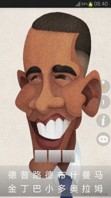 疯狂猜名人精选上百幅政治、体育、娱乐、影视、IT等各界世界名人漫画头像,看漫画图片猜人名。寓教于乐、十分有乐趣。和朋友比比自己能够认出多少名人。 奥巴马、金三胖、杰克逊、猫王、克林顿、卡扎菲、本拉登、贝多芬、赵本山...