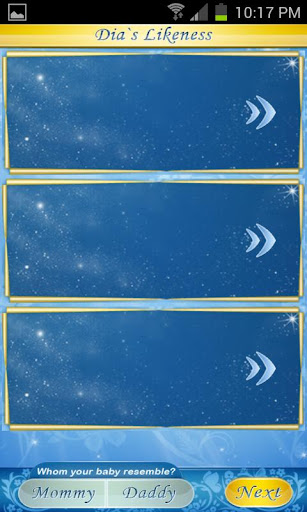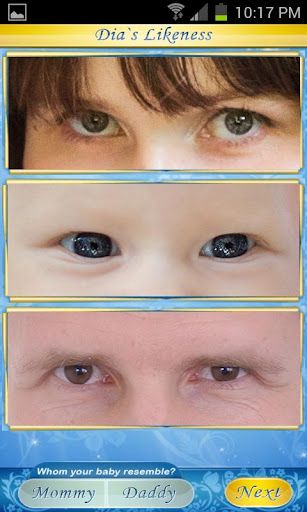 直徑的肖像高興能幫助你!這個簡單的和有用的應用程序會要求你採取不同的身體部位的照片,或選擇從您的圖書館。然後,它會放置三張照片(嬰兒,母親和父親)一起在屏幕上,這樣你可以很容易對它們進行比較。